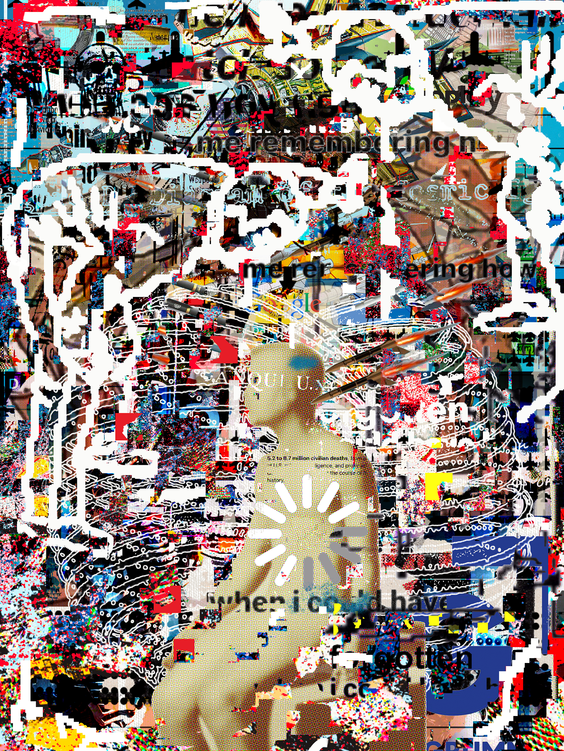 The process I have embraced for this series is one that attempts to seamlessly merge with the kaleidoscopic drift of content and create a feedback loop between life and art. As imagery floods across the various screens in my everyday life, following my interests of both research and recreation, I take constant screengrabs and image-saves that get curated and nested within each other. I then fracture, distort and arrange, rearrange, corrode, discard, and manually glitch these images in a way that seems to mirror the way my mind and memory process, flatten, store, degrade, forget and restructure them. Drawing inspiration from Rauschenberg's silkscreen collage paintings as well as the sacral art of medieval stained glass window panels I attempt to make memorials of meaning from this endless cycle of noise and signal.
